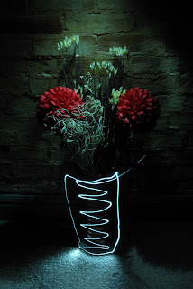 Shot 3 - Some flowers! I was trying to find another interesting object to trace, when I gazed upon this vase with fake flowers in that we have in our blocked up chimney hearth. I [poorly] traced around the vase itself, and gave a little fill to it, then held the light above the flowers for around 5-6 seconds. Only difference to camera was exposure time which for this shot was 18.8 seconds.