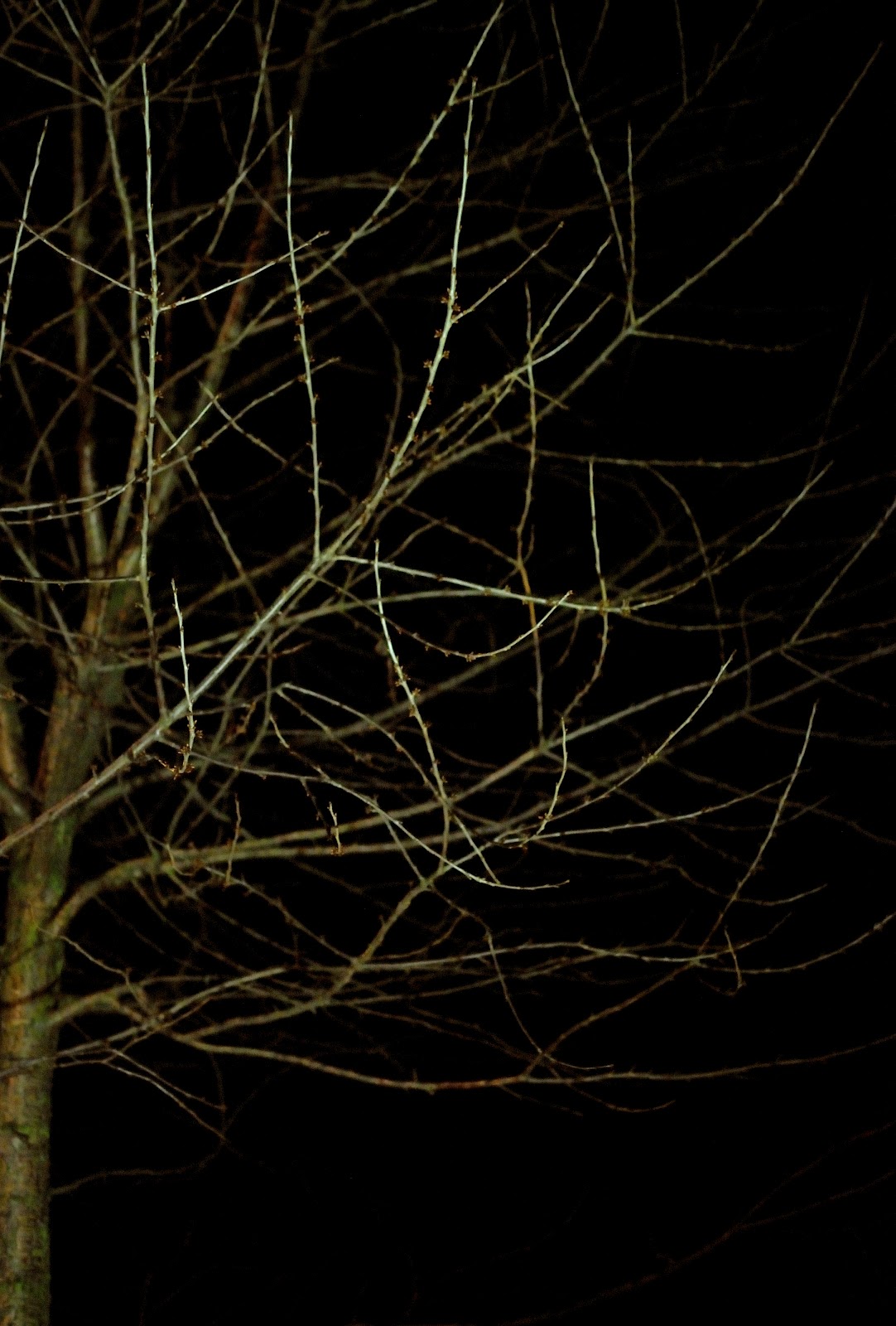 Shot 3 - Tree number 2! Street lamp is the source of light here. Camera - aperture f/1.8, shutter 1/30, ISO 1600. Post processing - got rid of a house roof from the bottom left, bump in contrast, and took a little white out of the light.